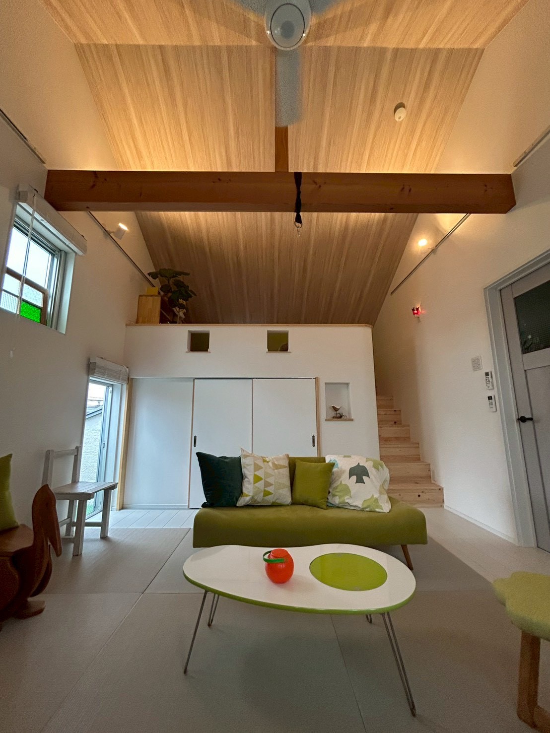 元々のおしゃれなクロスや、大きな梁を活かした空間にさらに遊び心のある素敵なロフトができました。