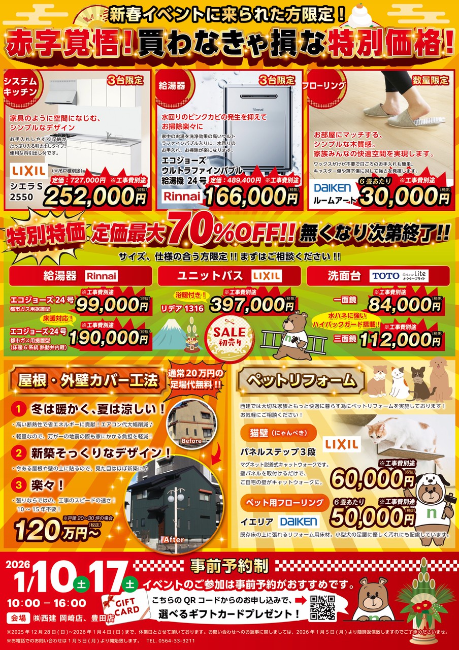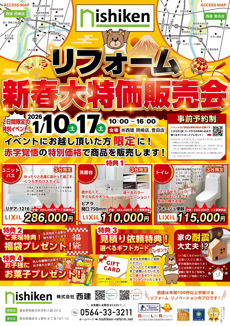 さて、1/10(土)と17(土)に開催される✨新春大特価販売会✨ですが、ご好評につき予約枠を増やしました👏どうしようかなー?と悩まれていた方は、この機会にお早めにお申込みくださいね♪ご来場特典の福袋やお菓子、見積り依頼特典の選べるギフトカードのプレゼントもございますのでこのお得な機会にぜひお待ちしております🥰