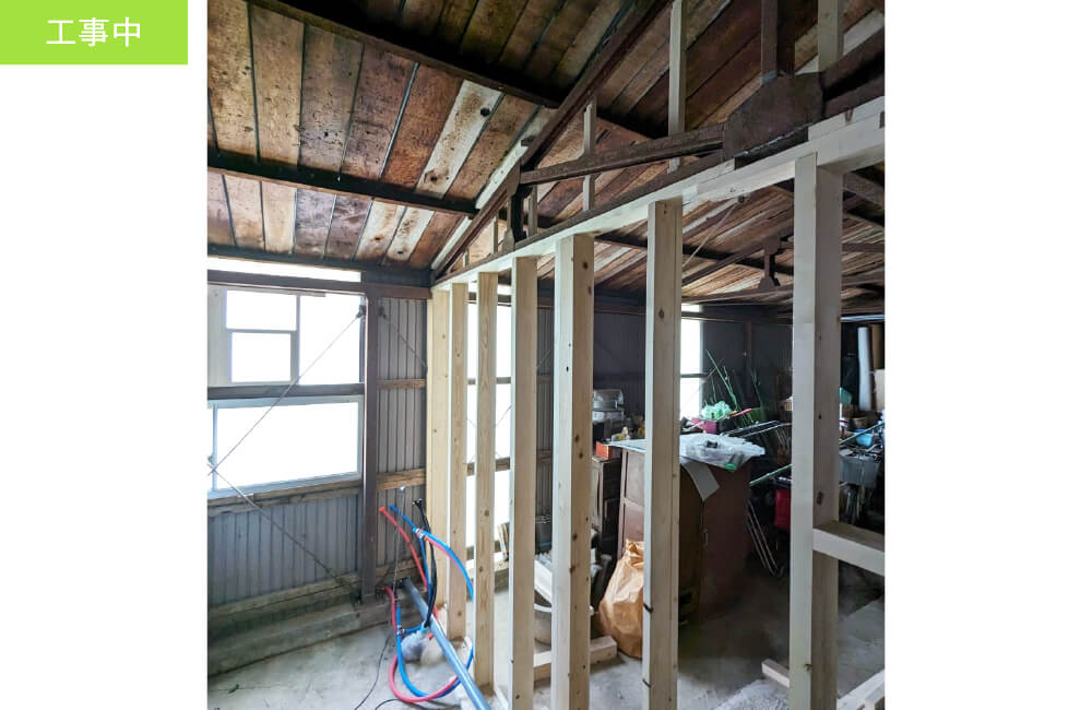 また、母屋にお住まいのお母さまが気を遣われないよう、お風呂も新設。何もなかった倉庫の部分に床を組み、お風呂を設置しました。